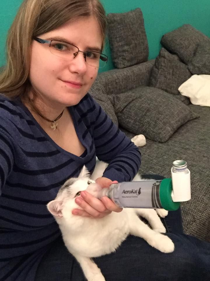 Mit Inhalieren reduziert man die Gefahr von Nebenwirkungen deutlich, da das Cortison direkt lokal an den Atemwegen wirken kann und kaum/nicht im Kreislauf aufgenommen wird. Inhalieren setzt in der Regel eine Gewöhnung heraus, die mehr oder minder lange dauern kann. Hier wird mit einer Speicherkammer (Spacer) und einem Spray gearbeitet. Du kennst sicherlich die menschlichen Asthmatiker, die ein solches Spray verwenden. Weil man aber einer Katze schlecht erklären kann ein solches Spray ins Maul zu nehmen, setzt man zwischen Katze und Spray eine Speicherkammer. Hier wird das Spray reingesprüht und die Katze bekommt den Spacer mit einer Maske auf das Gesicht gesetzt. Sie muss zur Aufnahme des Sprays dann einige Atemzüge atmen.