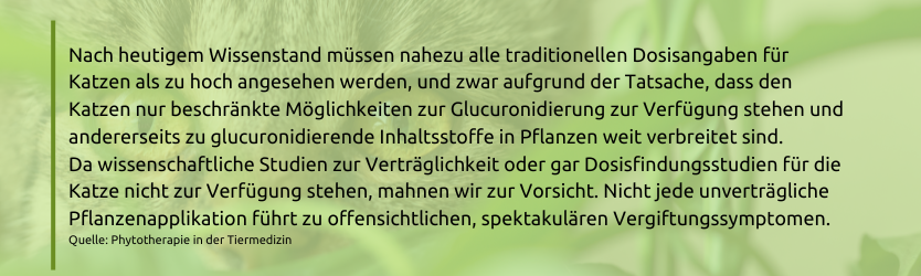 Und nun wissen wir ja, dass Katzen nur eingeschränkt die Möglichkeit zur Verstoffwechslung verschiedenster Stoffe haben. Das ist die sogenannte Glucuronidierung. Und andererseits müssen viele Stoffe, die in Pflanzen zu finden sind, darüber verstoffwechselt werden. Da beißt sich die Katze quasi in den Schwanz.